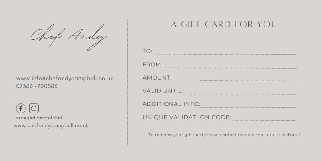 Treat yourselves, your loved ones, friends or business colleagues to a Gift Card Certificate. To enjoy a cookery class or dining experience with chef Andy. Utilize the Gift Card at the various locations Andy serves.
